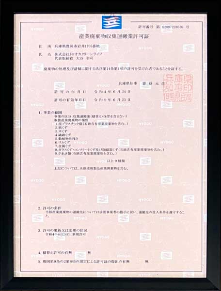 一般廃棄物収集運搬業の許可は、一般のご家庭から出た家具や家電を回収する際に必要な市町村からの許可です。市町村からの許可を得にくい一般廃棄物収集運搬業の許可ですが、株式会社トヨオカクリーンライフは一般廃棄物収集運搬業の許可を得て作業を行っております。
