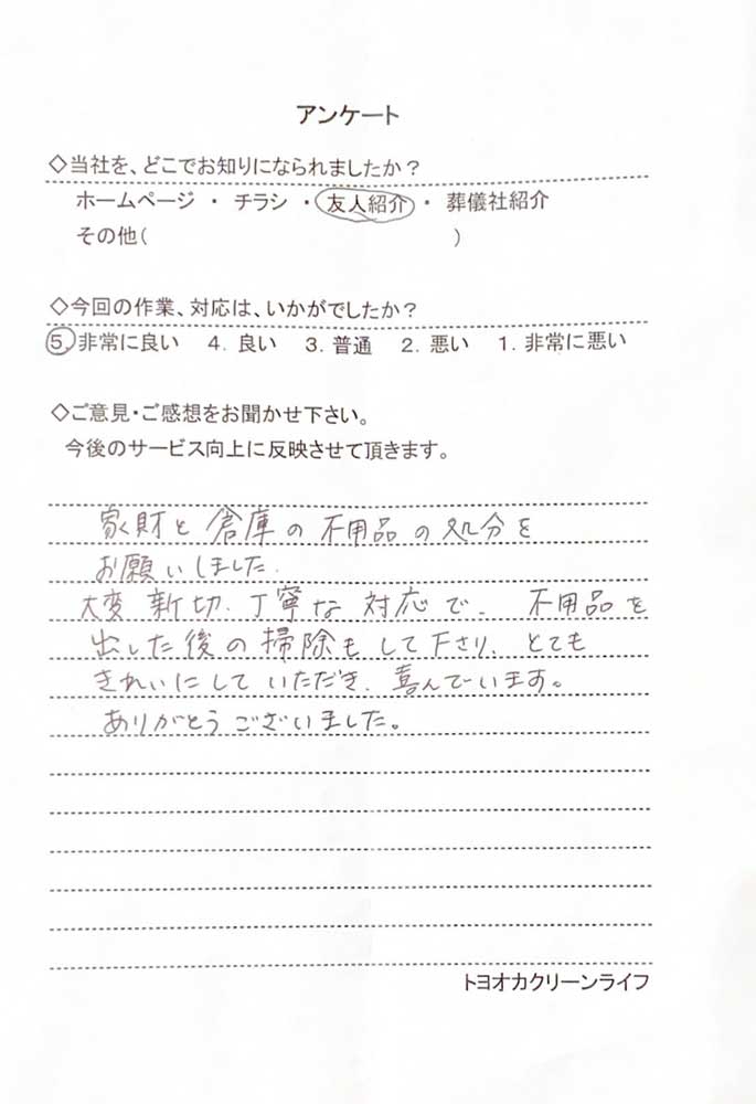 大変親切、丁寧な対応で、不用品を出した後の掃除もして下さり、とてもきれいにしていただき、喜んでいます。