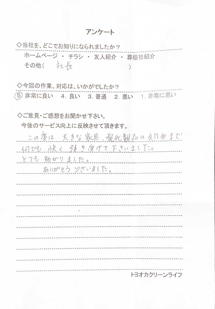 この度は、大きな家具、電化製品の処分まで、何でも快く引き受けて下さいました。